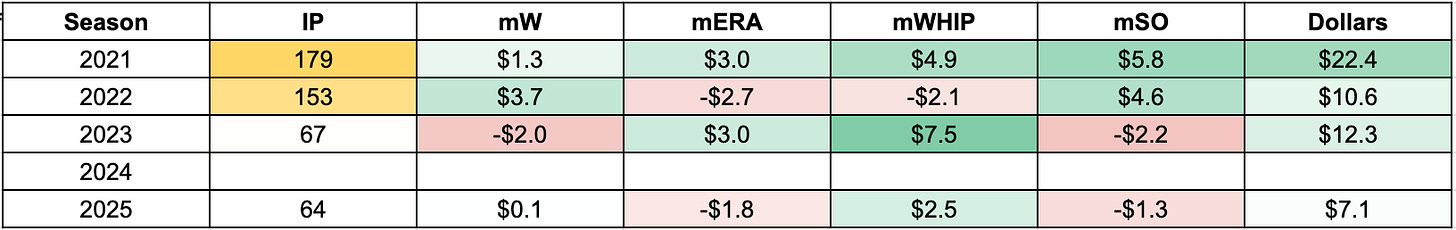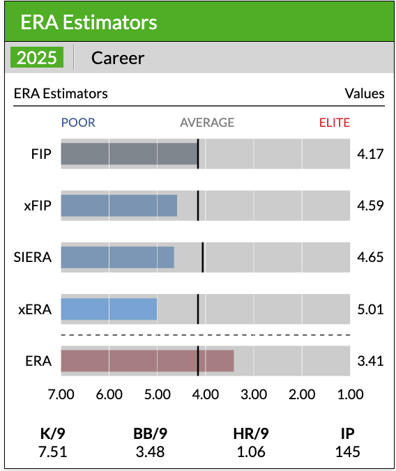 The biggest red flag: his strikeout rate dropped by six percentage points from his 2022–23 levels. His movement profiles didn’t really change. And the ERA overperformance looks like a fluky HR/FB rate more than anything repeatable.