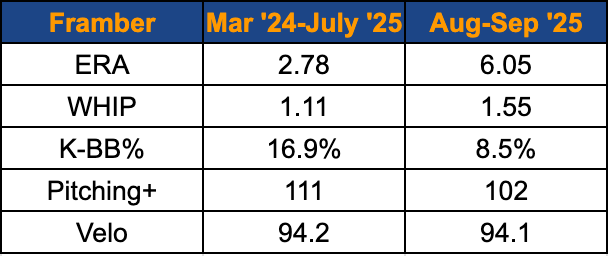 Framber isn’t as flashy as Cease, but he’s been the steadier fantasy option. His elite ground-ball rate makes him less reliant on strikeouts, and from the start of 2024 through July 2025, he had a 2.78 ERA and 1.11 WHIP with 310 strikeouts in 310 1/3 innings.