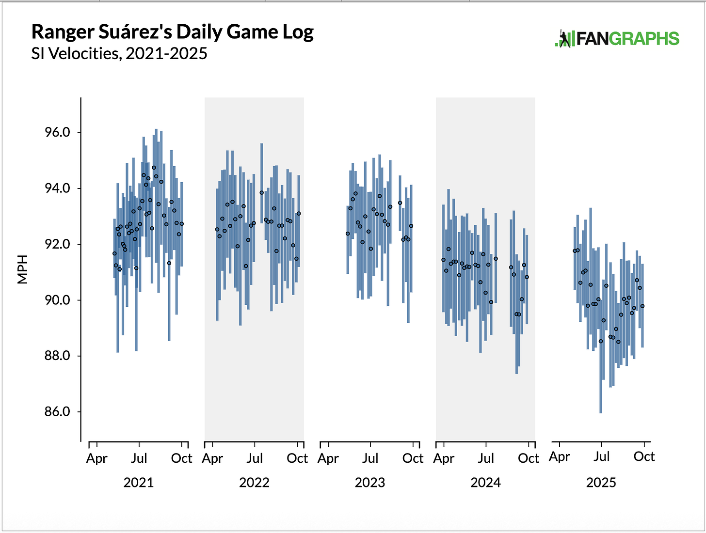 And that’s the concern as he enters his 30s. Suárez’s velocity fell to just over 91 mph last season, and he still hasn’t thrown more than 160 innings in a season. He also averages fewer than a strikeout per inning.
