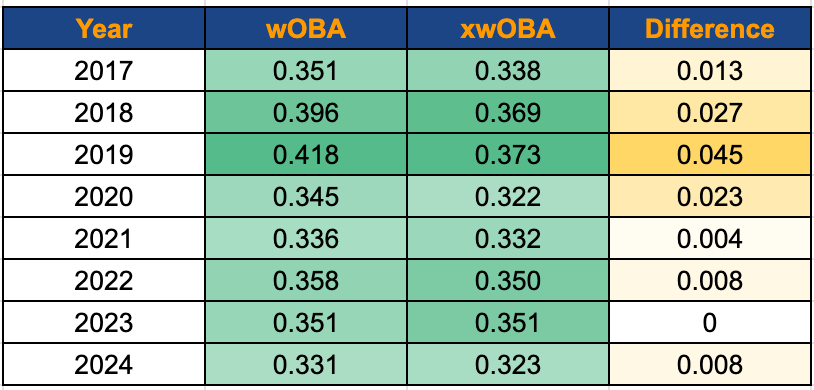 Bregman’s 2024 barrel rate was higher than in 2019, again showing his reliance on the Juiced Ball era, which is when he was significantly over-performing his expected stats: