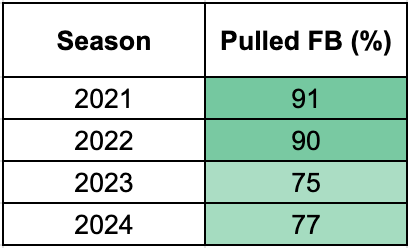 What stands out most about his 2024 is the sudden decline in walk rate—6.9% after not falling below 11% since 2017.